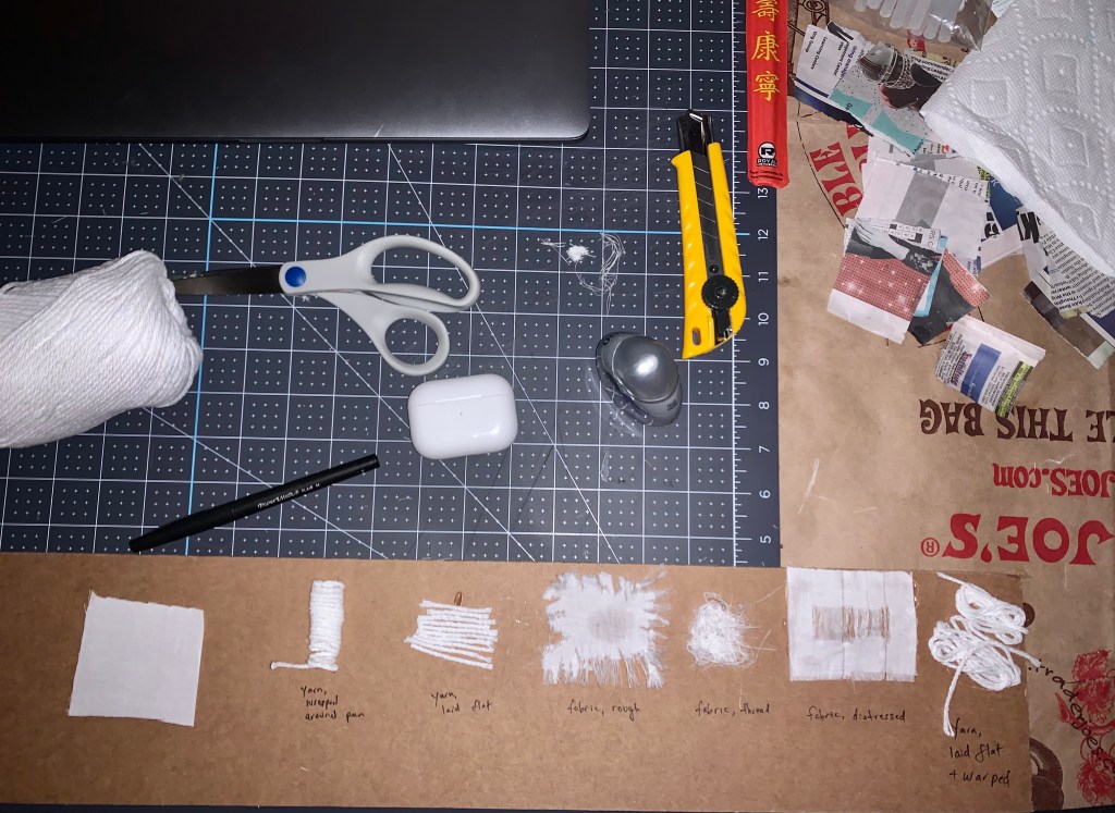 For my object of affection, I decided to recreate my favorite hat that I’ve had for almost 6 years. I chose this to recreate because I’ve had it for so long and you can tell – the colors are very faded (went from a deep navy to a faded purple/brown) and I’ve had many memories with it. It fits my head the best out of all the hats I own and is very soft and worn. Thus, I treated the surface as soft as possible. Because the object had to be paper mache, I had to make sure the material made it look soft, so I used yarn under some fabric that wasn’t attached all around to make it soft and somewhat moldable but still worked with the constraints of the project.