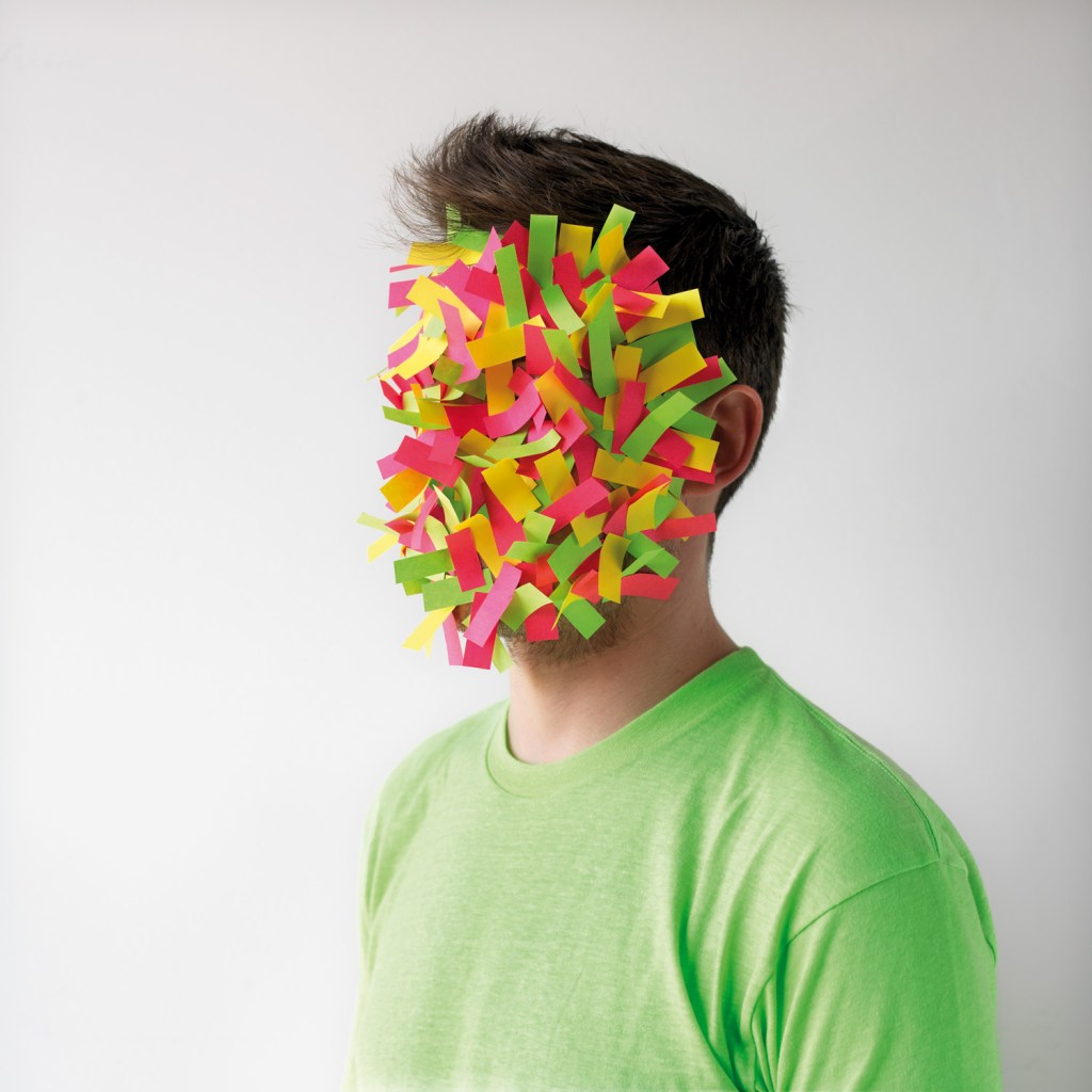Personally, I looked past the metaphor with his printing process and thought about how this art could express a person’s emotion without being able to see their face. This first paper face manipulates the body by extending the face with many pieces of square paper that seems to have been folded. The second uses pieces of black paper cut into diamond-like shapes, arranged to look like flowers or bows with a crease to give it more texture. The third uses multiple rectangular shaped pieces of small colored paper arranged in a random fashion.