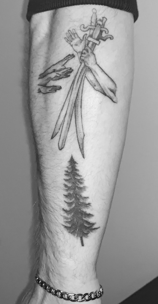 One thing that really helped me understand the movement of tattoos across the body was photographing my own tattoos and observing how they stretch and warp with the skin as they tend to wrap and morph with movement of the body. This was also very helpful as I had a reference to understand how tattoos can be rendered onto skin digitally, which is evident in my mockup below.