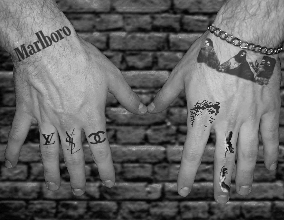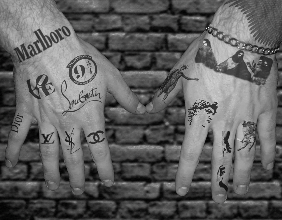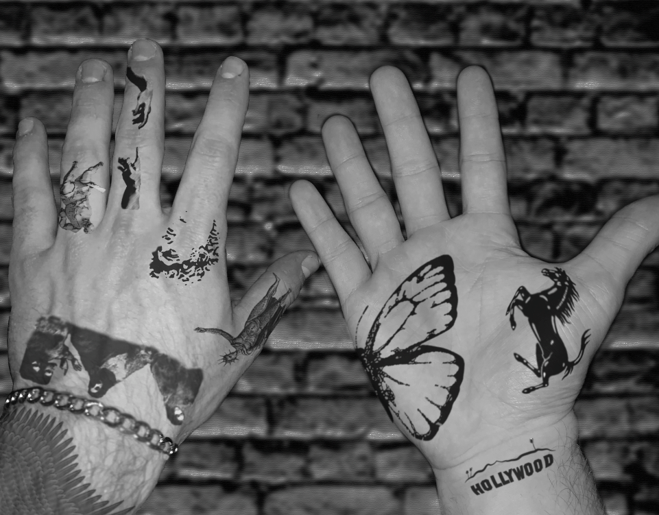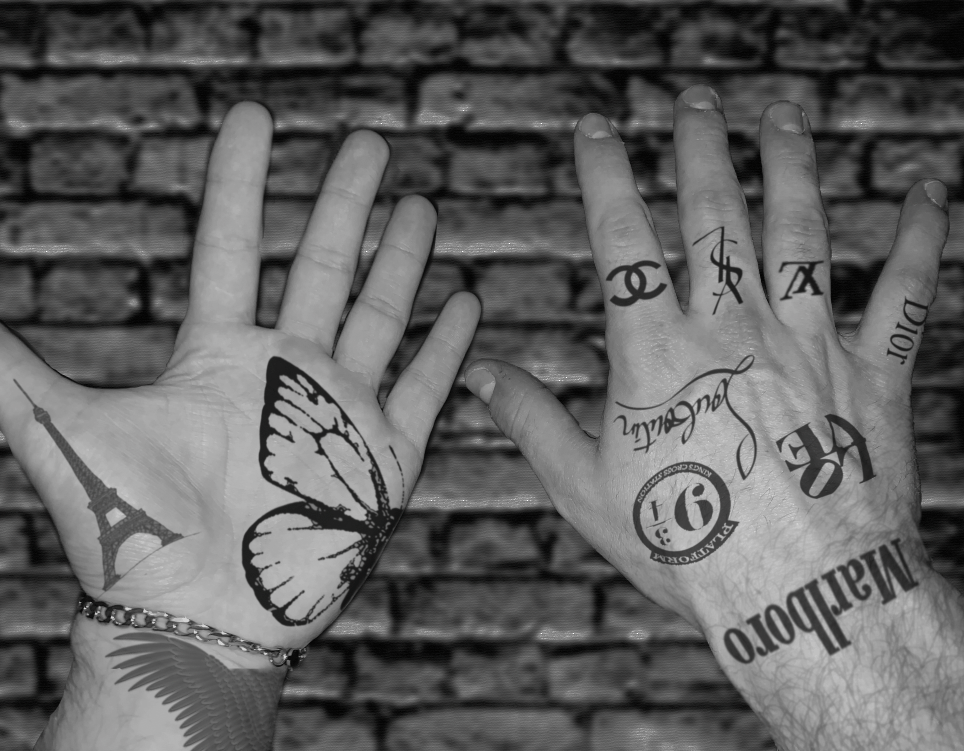 I have been using mostly Photoshop and image galleries online to create these mockups. Down the road, I will likely add more images of my hands in slight movements and then print them and create a flip book sort of thing to really apply motion techniques to the end product. To explain again – hand tattoos are pretty uncommon for people my age, so I wanted to create digital mockups of what they would look like on me. Both my hands highlight what can be good or bad about the tattoo art industry, as one hand is marked up with logos and such and the other is covered in historical art pieces. The final product will look like a digital gallery of a few images and likely a physical flip book to highlight my hands’ movement and the movement of the art on the skin as it stretches and morphs.
