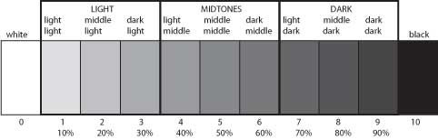 A key concept while thinking about the principles of design is value. Put simply, value is the emphasis on the lightness versus the darkness of color in a design or work of art. Below is a value scale depicting a basic concept of value. Value allows artists to create contrast or place emphasis on specific areas of their design just by making one area darker or lighter than another.