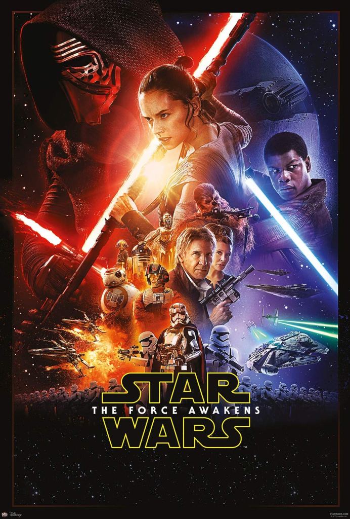 Further, the ideas of scale (size of an object in relation to its standard or expected size) and proportion (size relationship of an object’s parts to the whole) can be applied to emphasize certain aspects of a design. A common example of this is the Hieratic scale, where significant figures are depicted the largest. This originally is shown in Egyptian art, but was made popular in several movie posters. The Star Wars movies used this in almost every movie poster they put out. Below is the movie poster for The Force Awakens, where all of the most important characters are shown the largest.