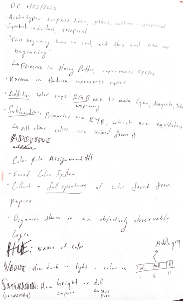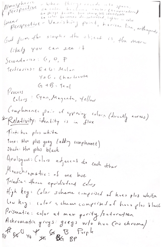 Not only was this first project a good experience for me to kick off more art projects like this in the future, but it was humbling as I can now compare myself with the people around me and always have a little competition in the back of my mind which will be key when I have to build my graphic design portfolio that will be compared to hundreds of others when entering the field. For now I’m happy with my entrance into the program but I have to stay committed and maintain a high level of work ethic that I’ve been working on developing throughout the semester. Included at the bottom of this post are glimpses of my notes throughout our lectures.